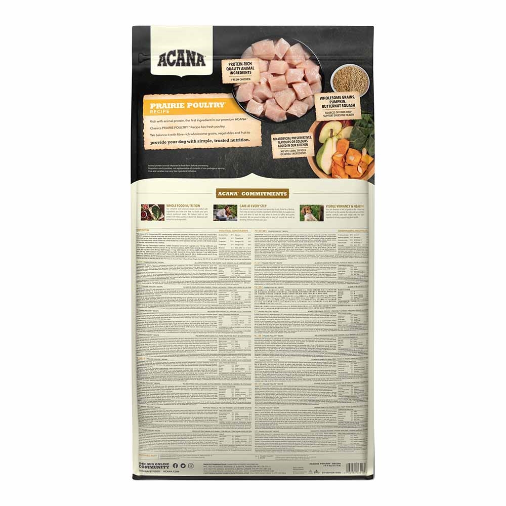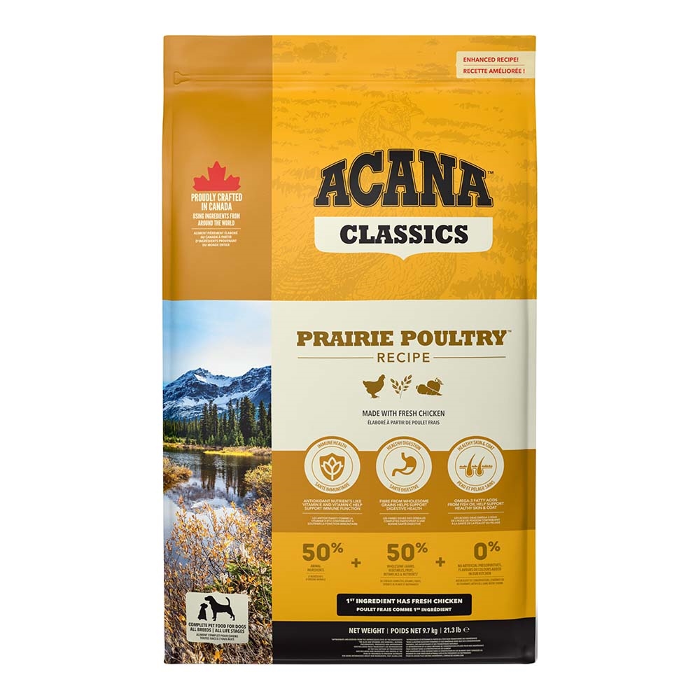 ACANA™ Classics Prairie Poultry tørfoder til hunde i alle livsfaser er sammensat af fersk kylling, frugt, grøntsager og sunde kornprodukter, som dit kæledyr har brug for til at forblive glad, sund og stærk.