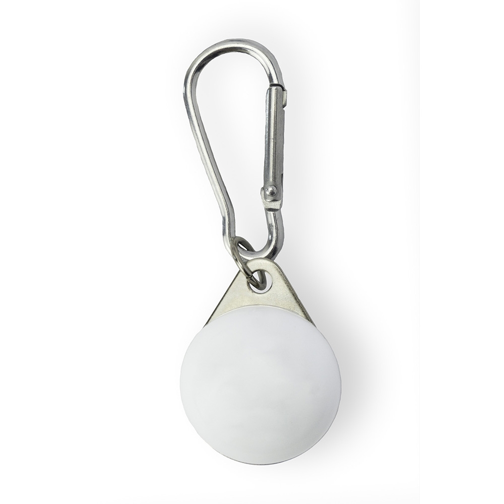 Denne hundelygte i hvid kommer med en sølvfarvet karabinhage. Du kan sætte den i hundens halsbånd, sele eller hundeline. Du kan også bruge den selv på din taske, cykel eller barnevogn.