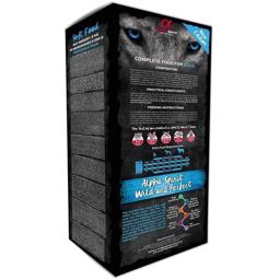 Når man læser på kassen så får man følgende data: Omega 3 og 6, DHA, EPA, Vitamins B complex og Zinc: Omega 3 og 6 er gavnligt for huden og pelsen. Pelsen får en blød struktur og mindsker fældning. Zinc er en vigtig kilde af collagen og kreatin som også er vigtig for pelsen og huden. Yucca Schidigera: mod lugt på det som kommer ud af den anden ende. Copper, Magnesium, Zinc, Calcium Phophorus, Sodium Iron, Selenium, Selenium vitamins, Vitamin A, D, E, K, B1, B2, B3, B5, B6, B7, B9, B12, Calcium Phosphorus Flour, Zinc, Chondroitin sulphate, Clucosamine, DHA, Calcium Phosphorus, Yeast of Sacharomyces Cerevisiae, Vitamin A, EPS og DHA Tauring, Yeast of Sacharomyces cerevisiae, Taurine, Omega 3, 6 og 9, fish oil, oleic oil, Thyme Rosemary, DHA Seleniud iron. Dette er direkte afskrevet fra kassen. Der er som du kan se tonsvis af naturlige ingredienser og selv plast beholderen fodret er indelukket i er økologisk og organisk fremstillet. Så den forsvinder når den smides ud. Det er en komplet foder som indeholder alt en hund har brug for på daglig basis. Alpha Spirit har brugt den nyeste teknologi som er udført i 3 steps. Først de friske rå råvarer i deres egen saft. Så bliver produktet fremstillet og frysetørret. Der står masser af data på pakken..