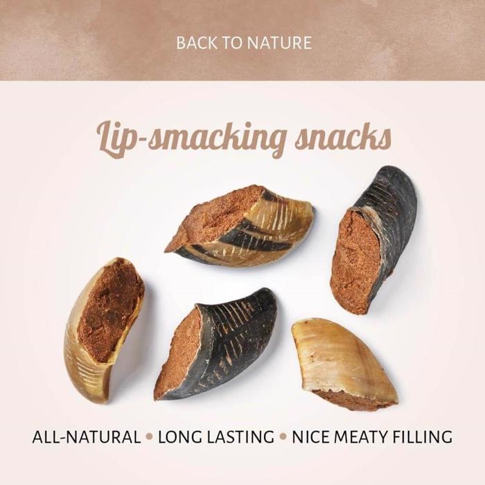 Fyldet har en lækker smag og når den er tømt kan du vælge at fylde den igen med lige det du ønsker. Rigtig mange hunde tygger også kloven. Du skal altid holde din hund under opsyn når den ligger med tyggeben. Du kan eventuelt tage det fra din hund når stumpen bliver for lille. Nogle hunde kan sluge det sidste. (det har jeg selv en bandit der gør)