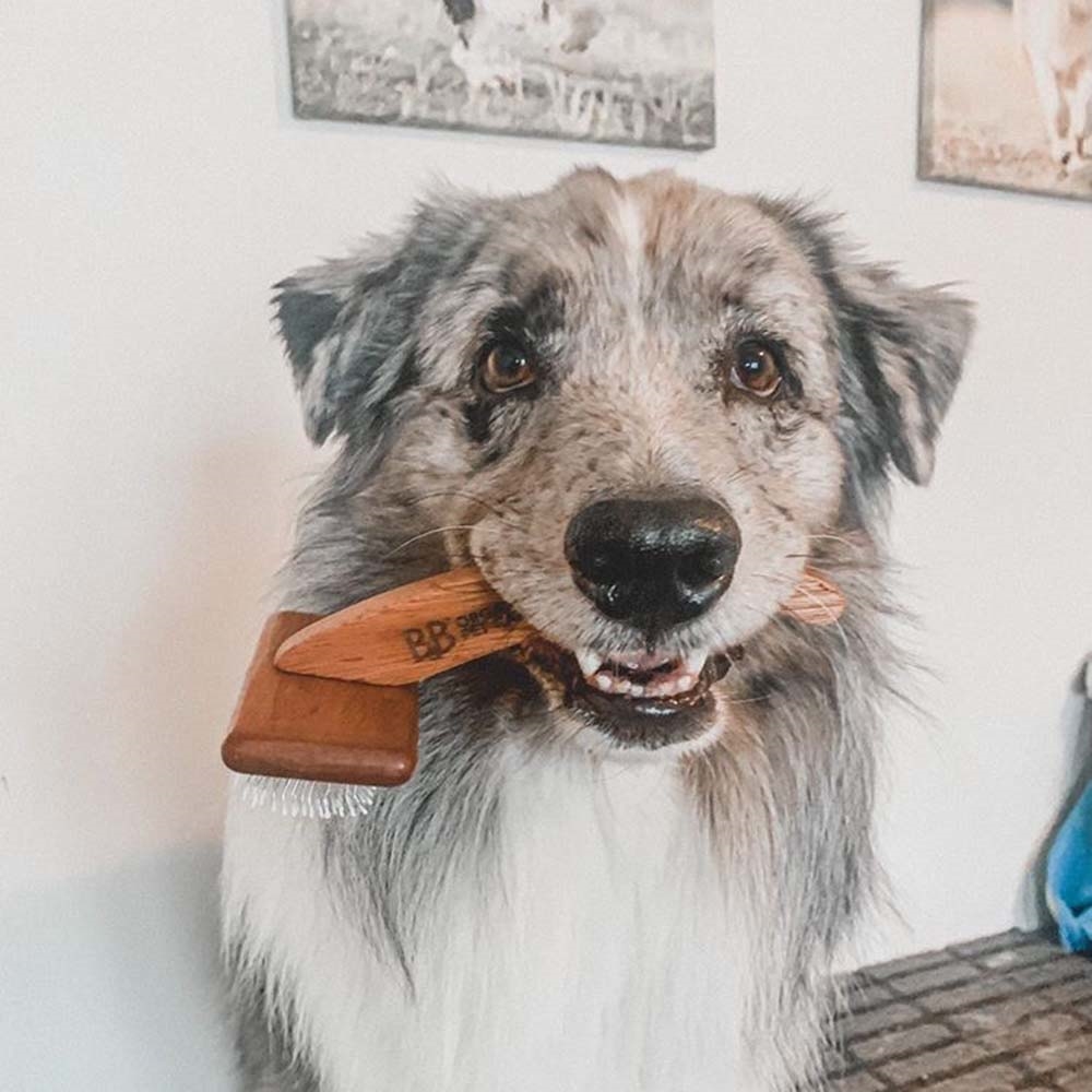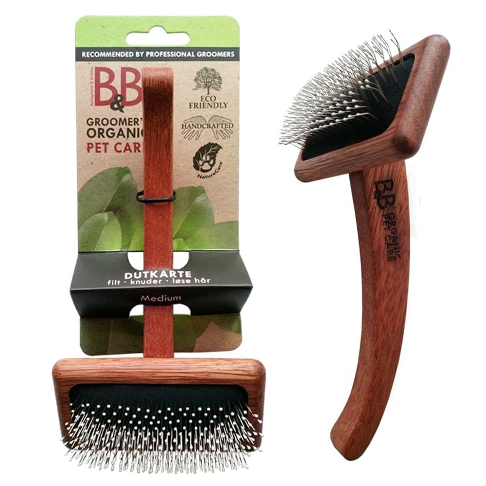 Karten har et ergonomisk håndtag fremstillet i bæredygtigt Tamanu træ, som giver et behageligt og sikkert greb under plejen. For et komplet resultat kan dutkarten med fordel kombineres med en af B&B’s kamme - eksempelvis guldkam, letvægtskam eller rullekam - så pelsen efterlades fuldstændig filtfri og glat.
