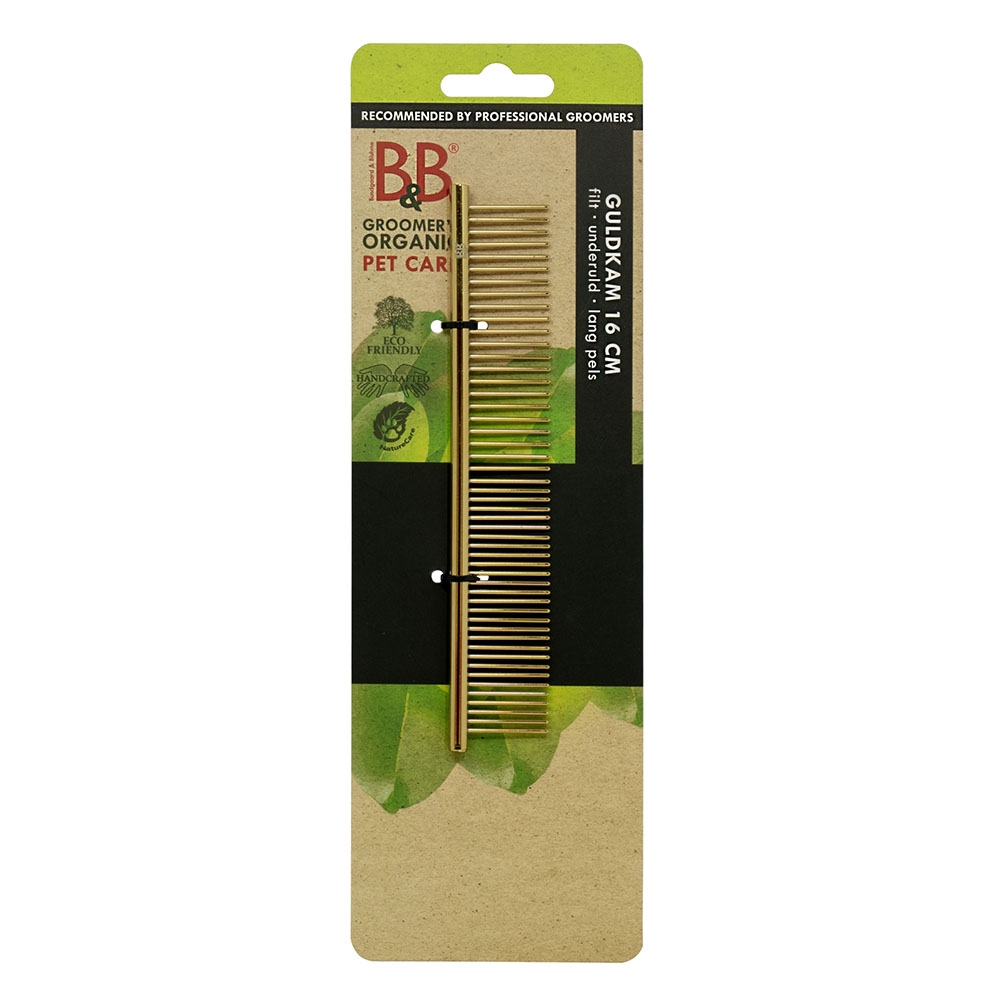 Denne guldkam fra B&B er solid og holdbar med afrundede tænder, der glider nænsomt gennem pelsen uden at irritere hud eller hår. Den opdager små filtre og løse hår, som karte eller børste måske har overset, og efterlader pelsen glat og velplejet.