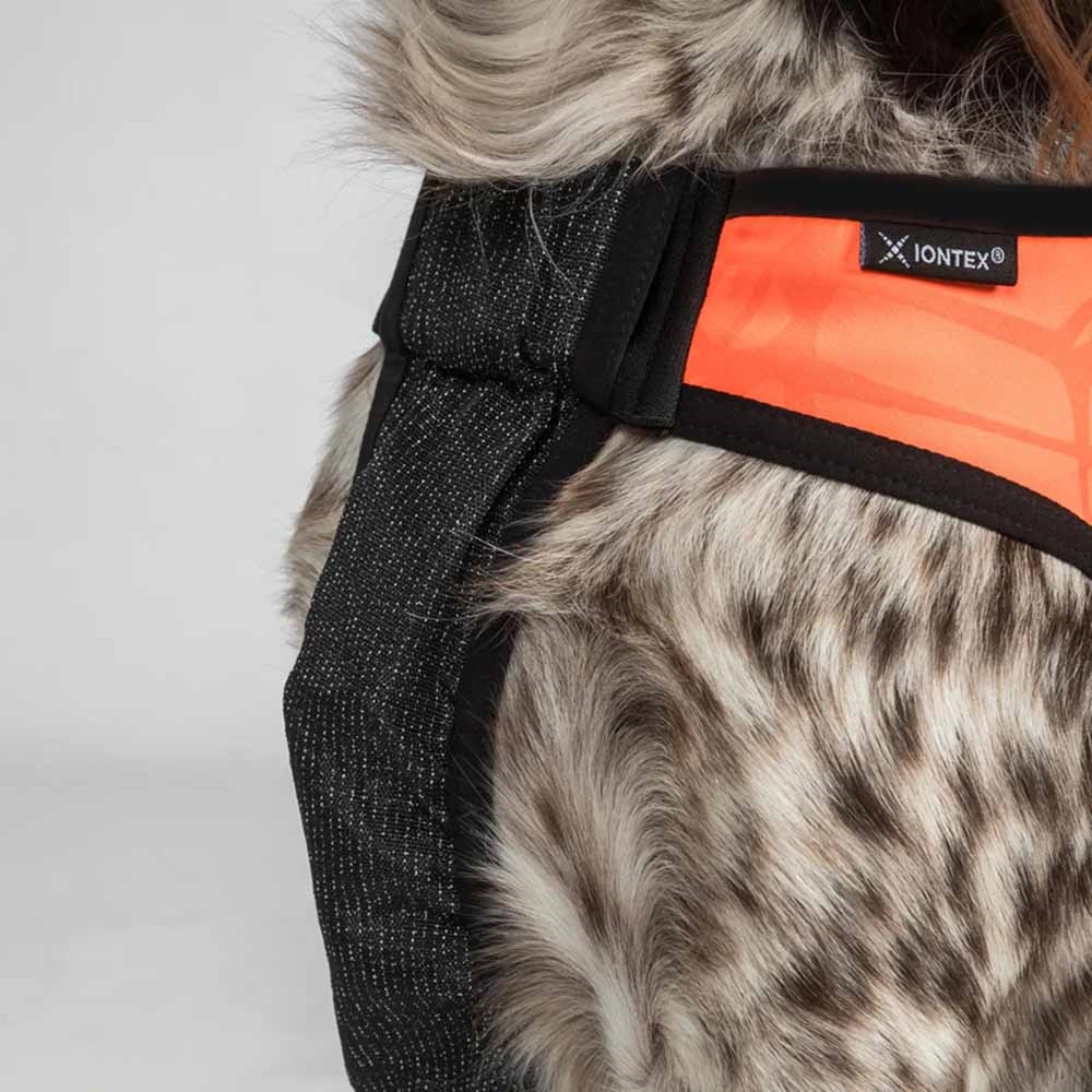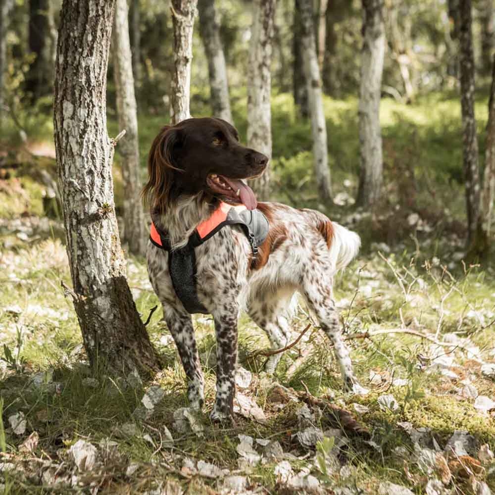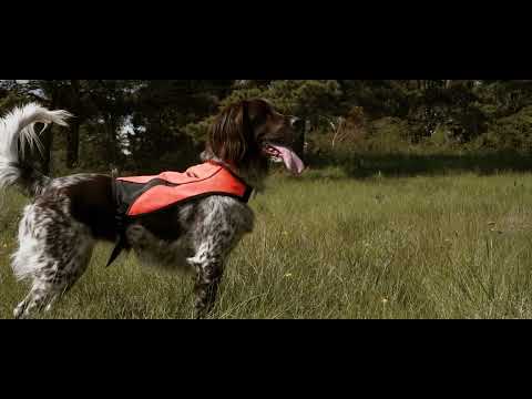 Det ydre materiale er både strækbart og vandafvisende. En forstærket elastisk brystplade beskytter hunden bryst og mave mod stik og skader fra grene og andre skarpe genstande i underskoven.