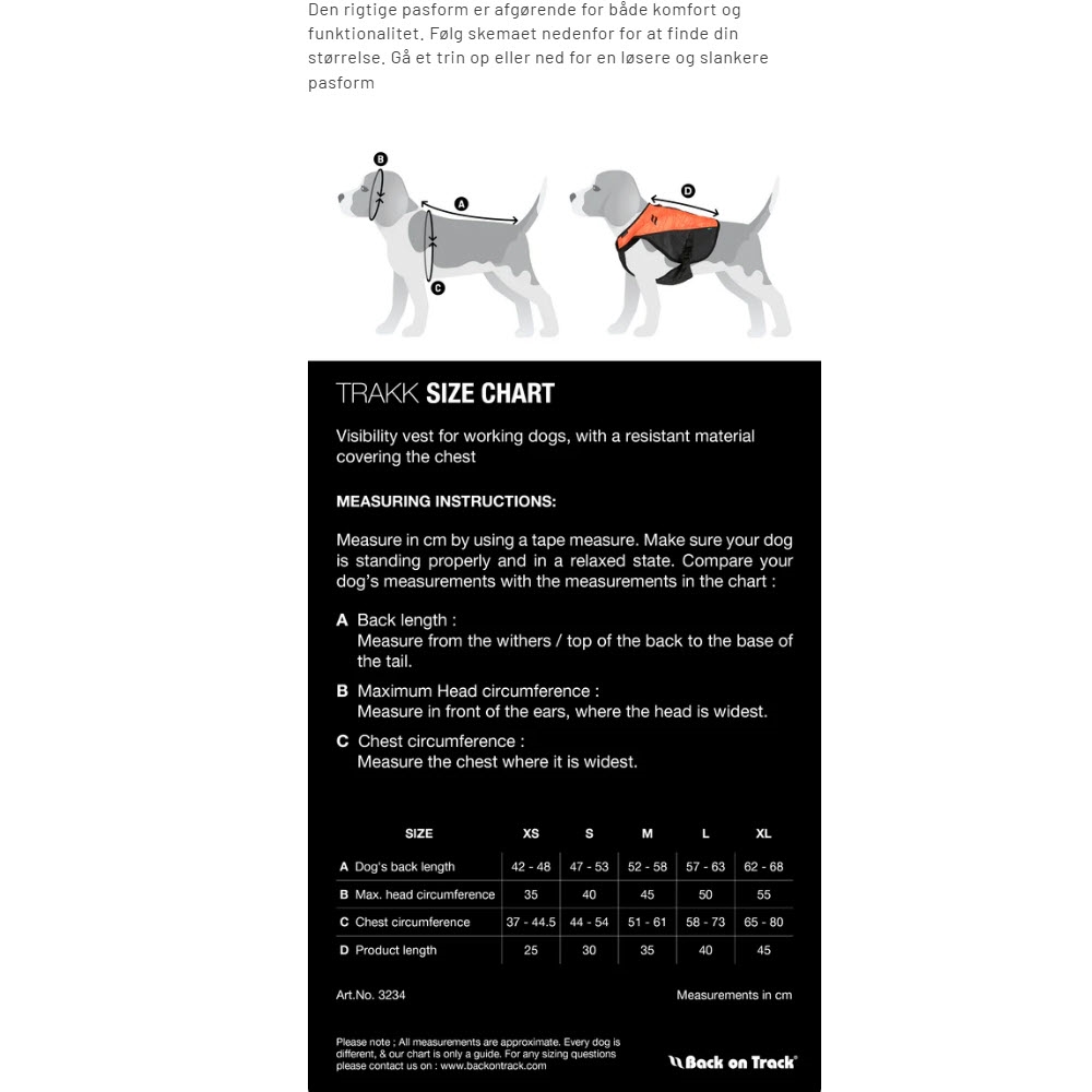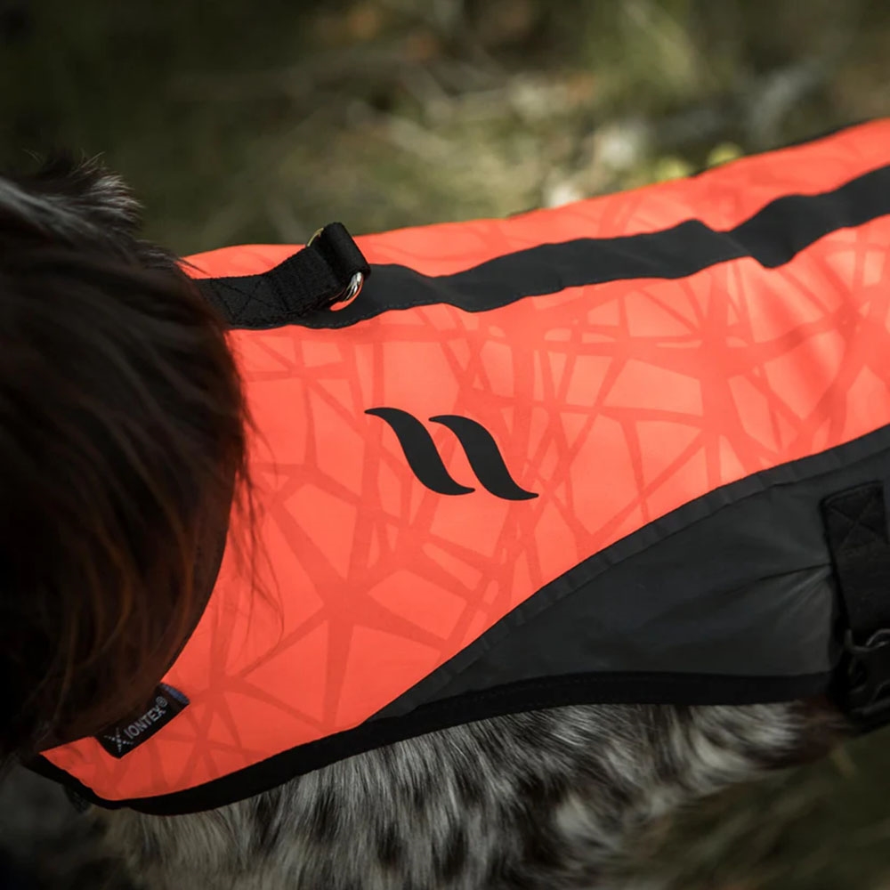 TRAKK er en orange beskyttelsesvest designet til arbejdshunde. Den klare og livlige farve sammen med et reflekterende mønster i materialet maksimerer synligheden både i skoven, på jorden og i svagt lys.