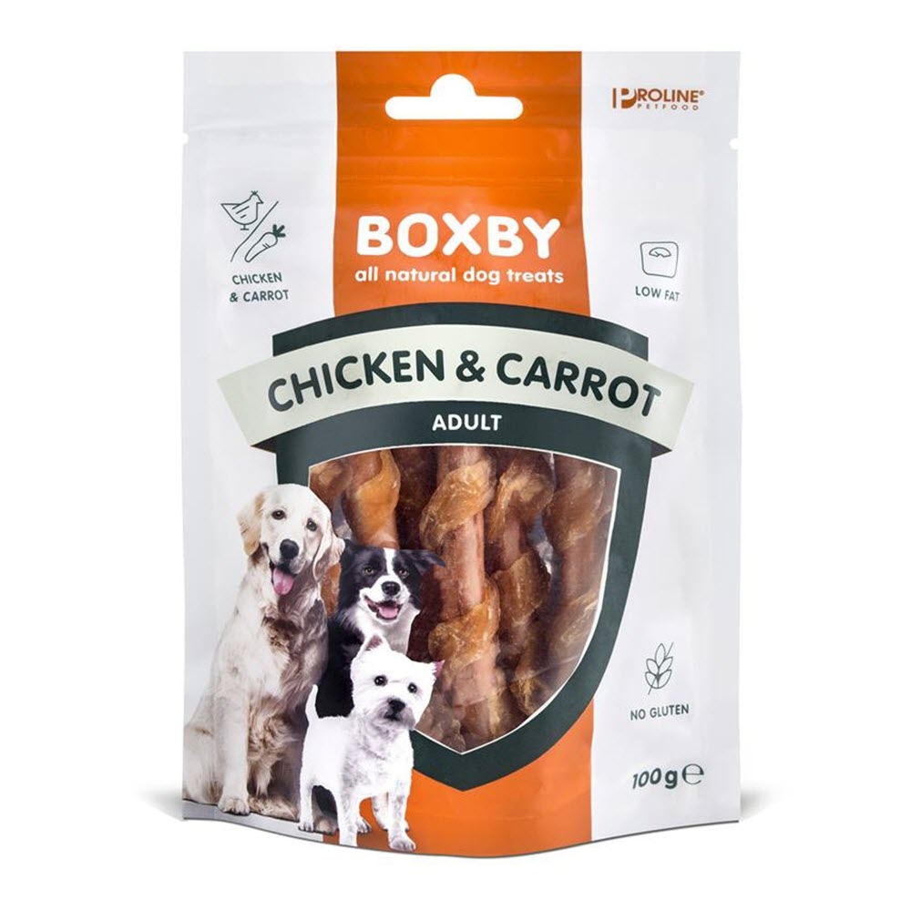 Boxby Kylling og Gulerod er en tyggepind med gulerod og kylling rundt om. De er fedtfattige, korn- og glutenfri
