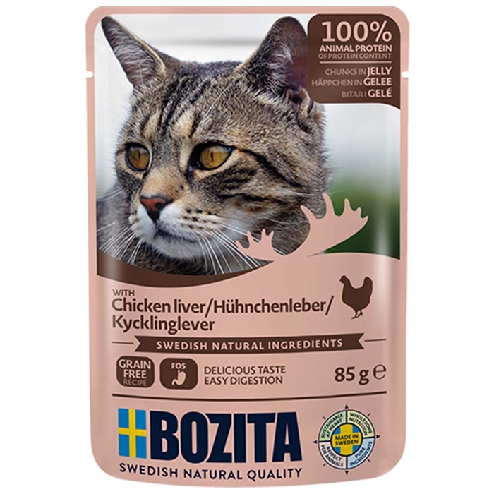 Bozita fuldfoder til katte bestående af lækre stykker med kyllingelever i gelé. Et meget velsmagende og lækkert foder til alle typer katte, også de kræsne.