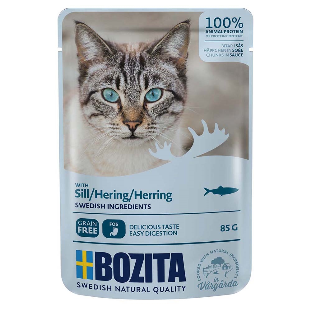 Bozita fuldfoder til katte bestående af lækre stykker med sild i sovs. Et meget velsmagende og lækkert foder til alle typer katte, også de kræsne.