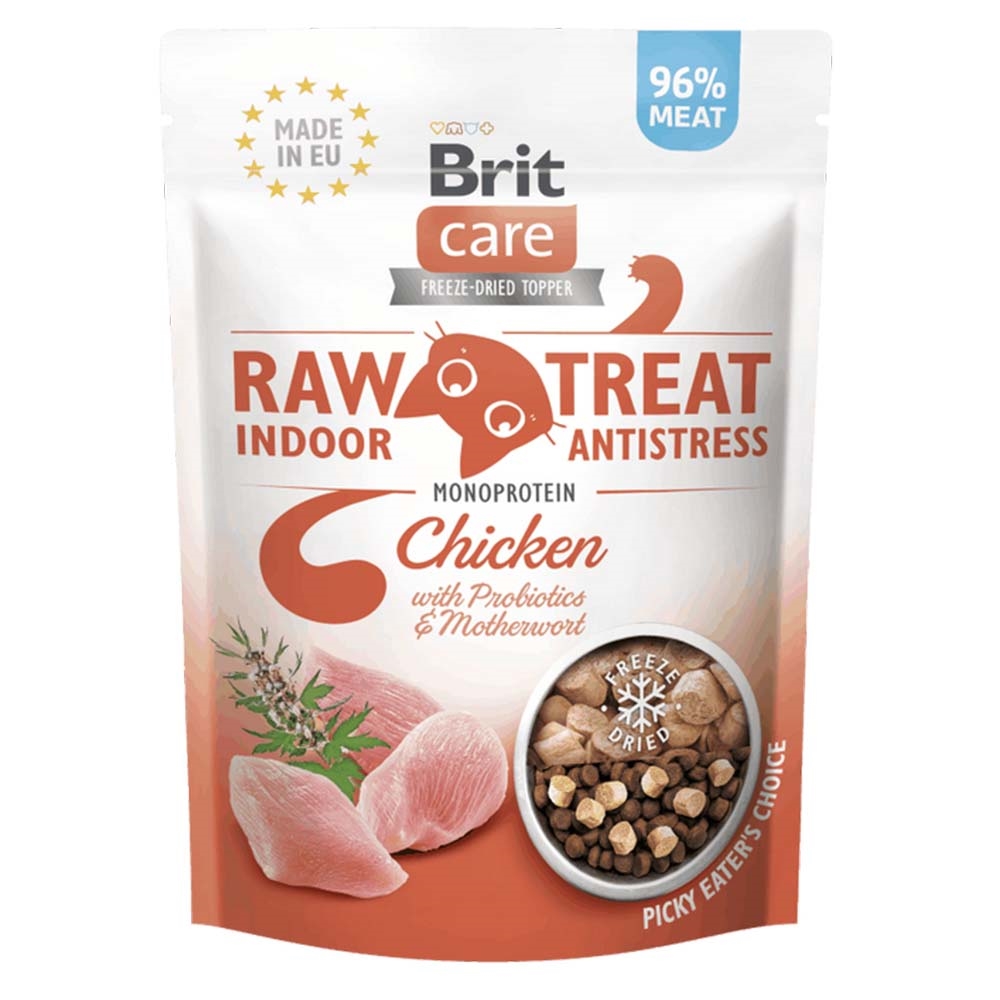 Forkæl din kat med Brit Frysetørret Snack Indoor & Antistress, lavet af 96% frisk kylling.