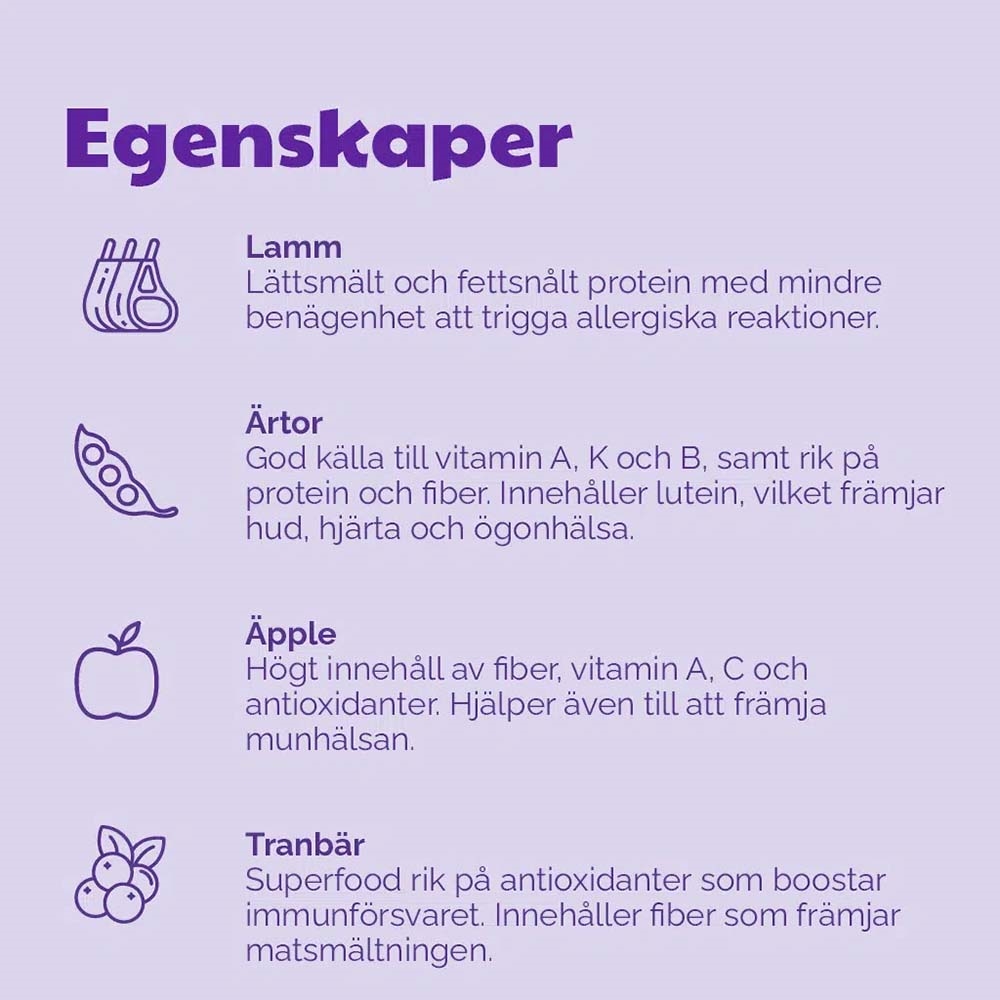 Der er 150 gram i posen. Posen er med selvluk, så dine godbidder holdes friske.Sammensætning: Lammeprotein 35%, ærter, hydrolyseret lammeprotein 15%, fjerkræfedt (konserveret med tocopheroler), tørret æblemasse, tørrede tranebær 4%, hørfrø, ølgær.