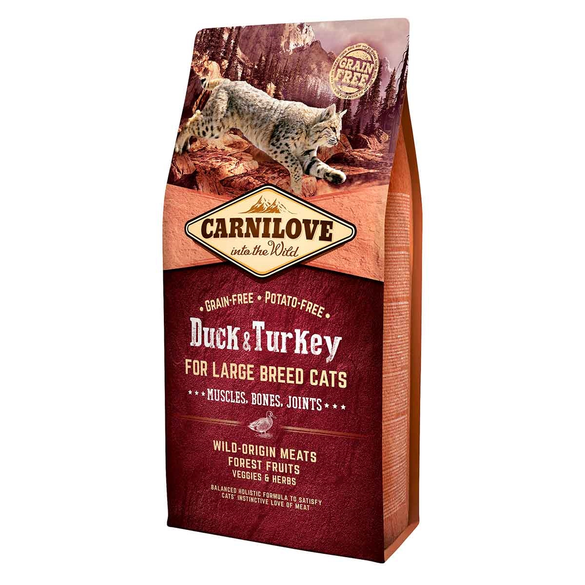 Carnilove kattefoderet her med and og kalkun forbedrer tilstanden i knogler, muskler og led hos katte af store racer, som foreksempel Maine Coon, Ragdoll og Norsk Skovkat.