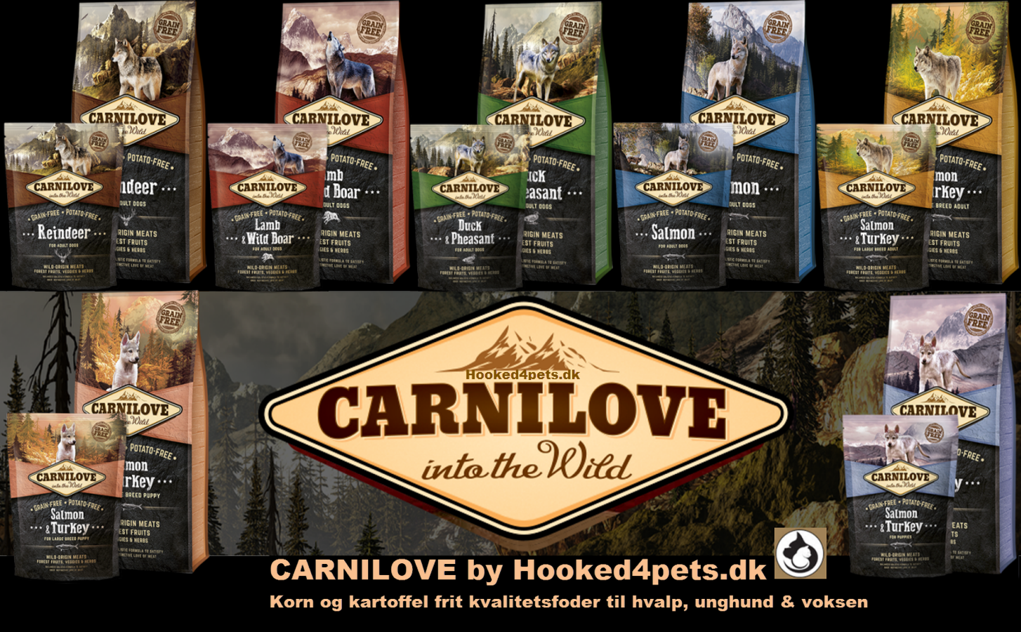 Du finder en serie til hvalpe og voksne hunde. Udvalget er udvalgt med rigtig kød, urter og grønsager i. Vi håber du bliver tilfreds med Carnilove into the wild serien.