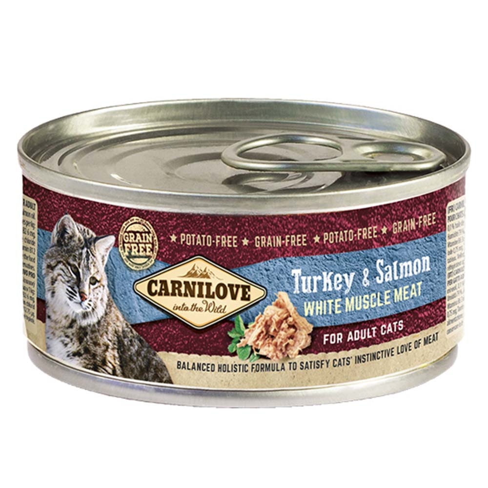 Carnilove White Muscle Meat Turkey & Salmon, er et saftigt korn- og kartoffelfrit vådfoder, lavet på rent hvidt kalkunmuskelkød, kombineret med mørt laks. White muscle meat er det rene bryst- og kropsmuskelkød fra kalkun, en letfordøjelig og proteinrig kilde, der matcher kattens naturlige præference for ægte kød.