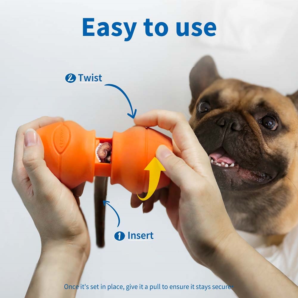 Holderen er designet med et unikt metaltanddesign, som minimerer risikoen for, at den løsner sig, hvilket giver ultimativ tyggesikkerhed og forhindrer kvælningsfare, hvilket sikrer dit kæledyrs sikkerhed og ro i sindet under snacktiden.