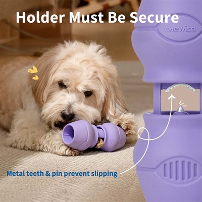 Holderen er designet med et unikt metaltanddesign, som minimerer risikoen for, at den løsner sig, hvilket giver ultimativ tyggesikkerhed og forhindrer kvælningsfare, hvilket sikrer dit kæledyrs sikkerhed og ro i sindet under snacktiden.