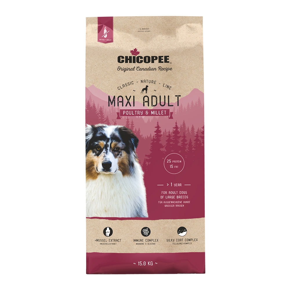 Sammensætning: Fjerkræprotein (tørret og hydrolyseret 27%), hirse (23%), byg, fjerkræfedt, majs, tørret roeflis (sukker fjernet), ærter (tørret), hørfrø (2%). gær (tørret, 0,5% mananoligosaccharider, 0,1% β-glucane), lakseolie (0,5%), calciumcarbonat, natriumchlorid, kaliumchlorid, monocalciumphosphat, grønlæbemuslingeekstrakt (0,1%)
