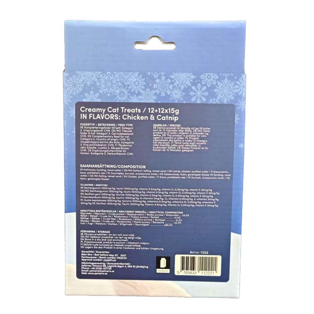 Glæd din kat hver dag i dagene op til juleaften, med i alt 24 cremede godbids stick. Du får 12 med kylling og 12 med katteurt.