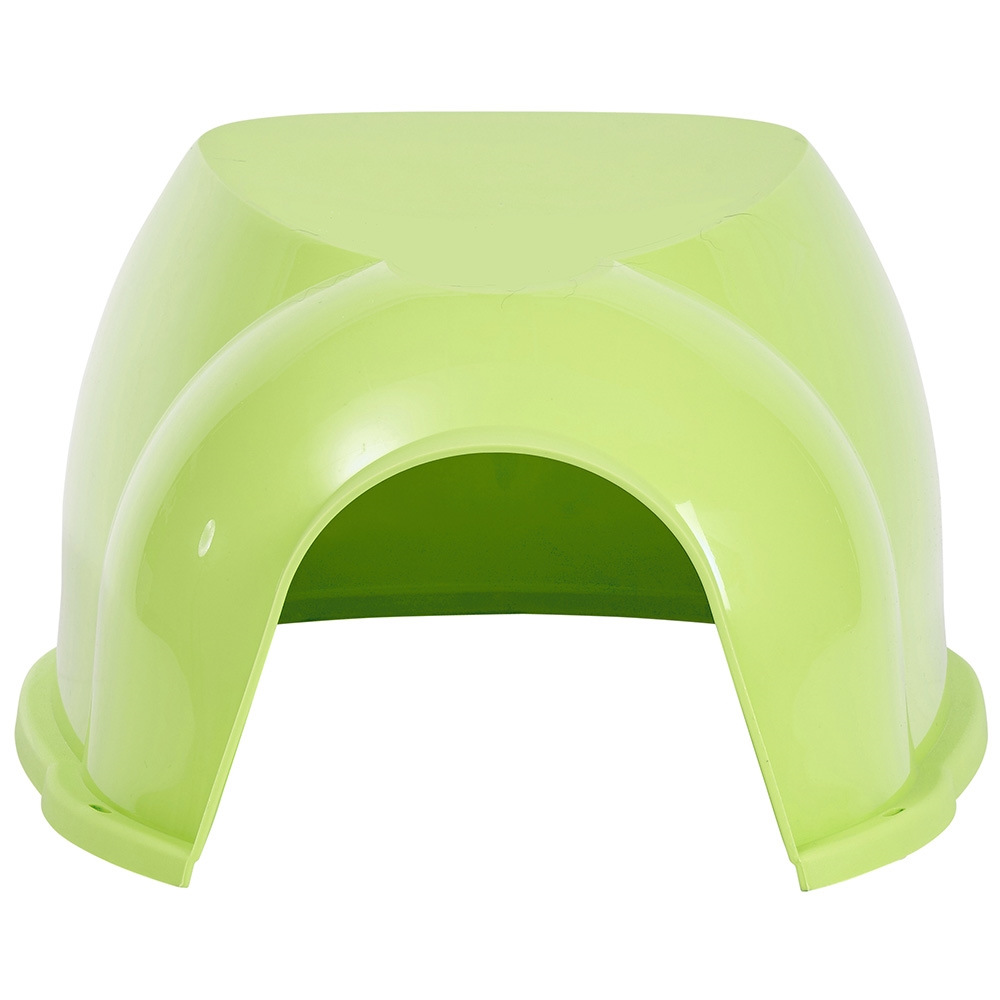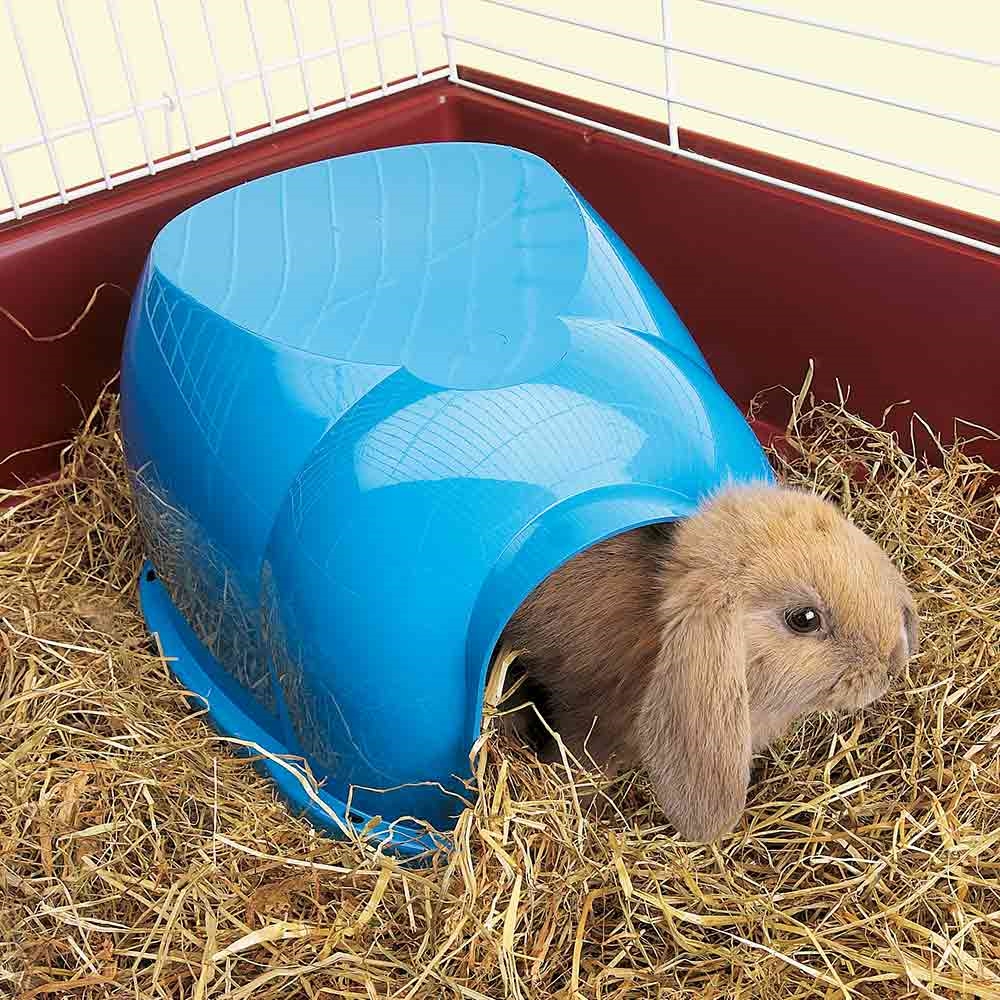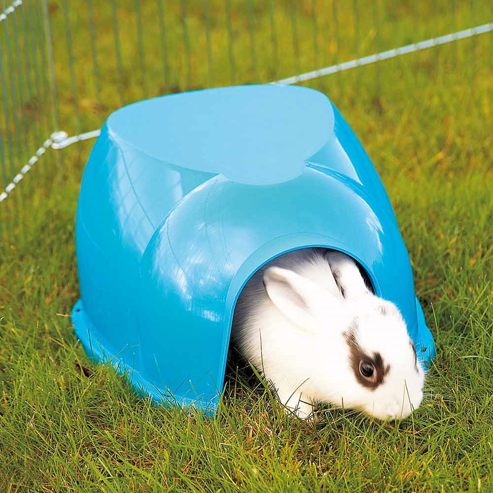 Plastik skjul til dværgkaniner, marsvin og andre mindre gnavere. Skjulet er blåt eller limegrønt.