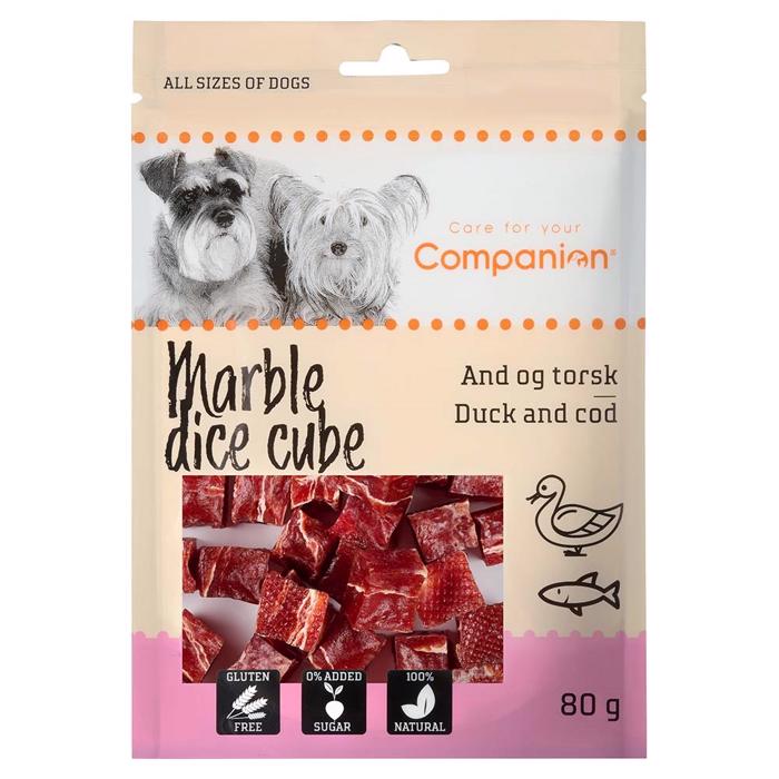 Companion Marble Dice Cubes, en lækker godbid med en fristende blanding af and og torsk. Med hele 92% and og yderligere 2% torsk er disse terninger fyldt med rig smag og sund næring, som hunde elsker. Fremstillet med omhu indeholder de også 3% kyllingebrusk, hvilket sikrer en velafbalanceret smagsprofil, der får din hund til at bede om mere.