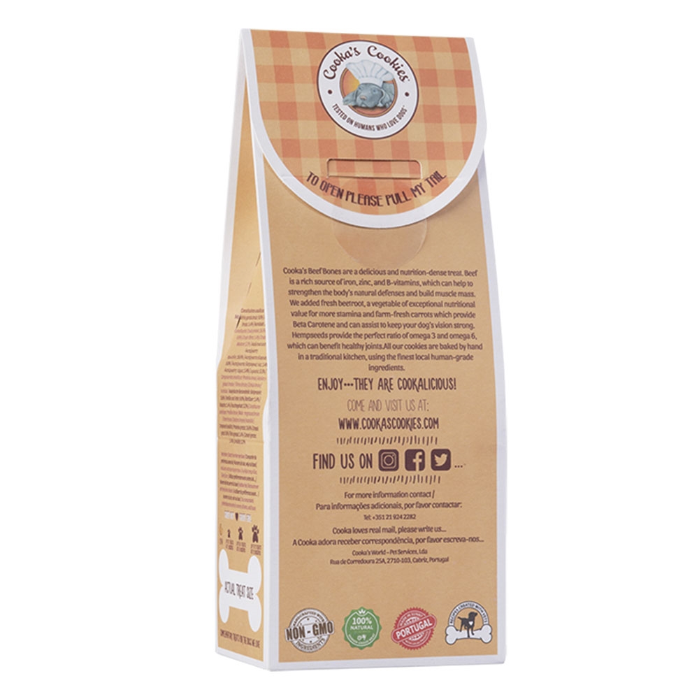 Her får du 100 gram hunde godbidder formet som små kødben. Godbidderne er hvede og glutenfri, og uden tilsat konserveringsmidler. Du kan med ro i maven giver disse guffer.