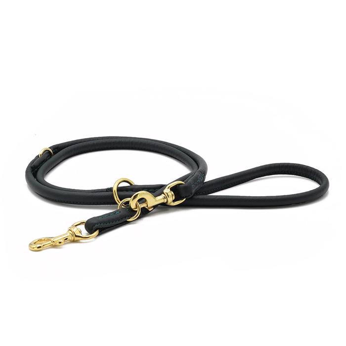 En hundeline for livet. Holdbar designer læder line i det blødeste fineste kalvelæder. De bliver håndlavet på den gode gammeldags måde hvor kvaliteten er i højsædet. Linen er justerbar i flere længder alt efter om turen går i bylivet eller ude i det mere fri. Farven på læderet her er grøn. Alle andre dele er udført i messing (guld).