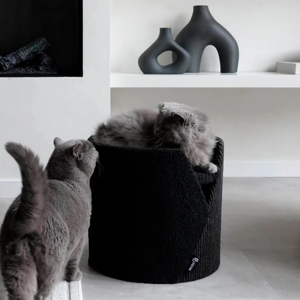 Smart rund kattehule beklædt med sisal, så den også fungerer som kattetræ.