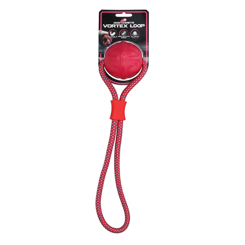 Dog Comets Vortex Loop er skabt til aktive hunde, der elsker apport og bevægelse. Kombinationen af en slidstærk bold og et stærkt, reflekterende reb gør legetøjet nemt at kaste langt - og nemt for hunden at få fat i. Den klare pink farve og de reflekterende detaljer øger synligheden, selv når lyset er lavt.