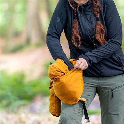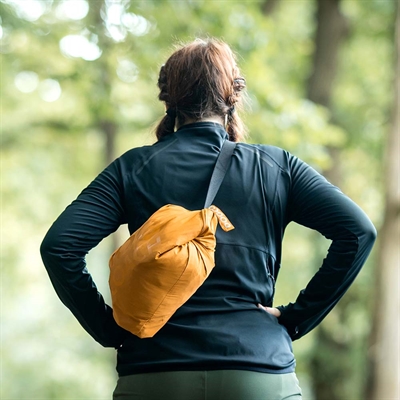 En ekstra fiks funktion er den elastiske strop, der gør det muligt at bære jakken over skulderen eller hoften, når den er pakket sammen – eller bruge den som et bælte, hvis du ønsker at fremhæve taljen.