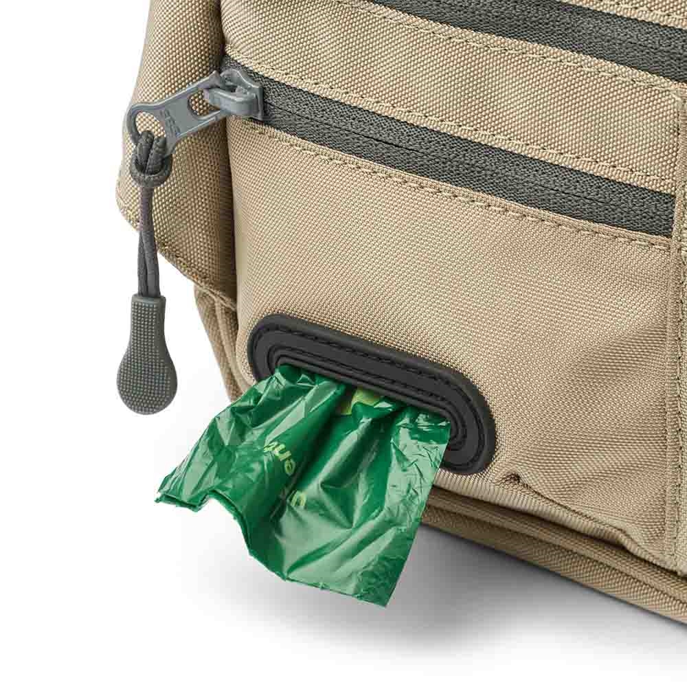 Fra din telefon, pung og nøgler til de essentielle velsmagende godbidder og hundeposer der er praktisk opbevaret i den indbyggede dispenser. Tasken har en indvendig lomme og to lynlåslommer på ydersiden.