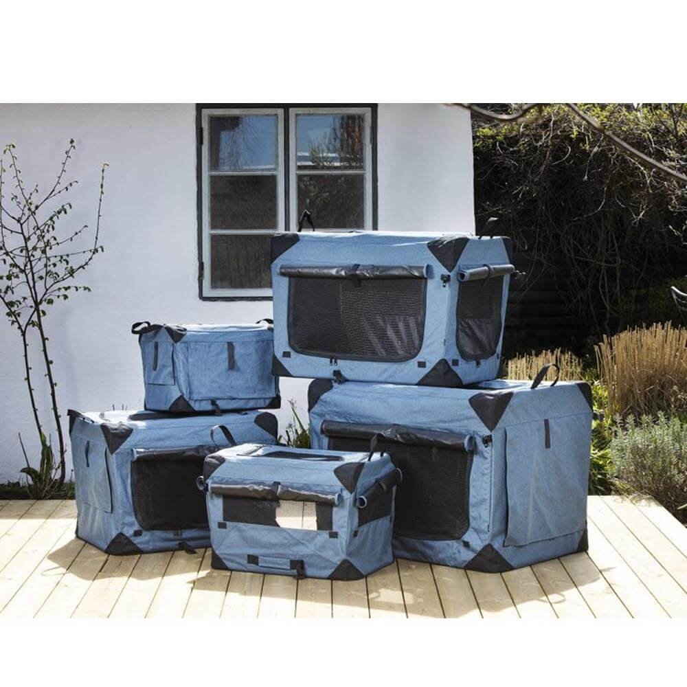 Her får du et lækkert praktisk sammenklappeligt transport bur i canvas stof til din lille, mellem og store hund. Eller for den sags skyld kat, eller andre kæledyr der skal med på tur.