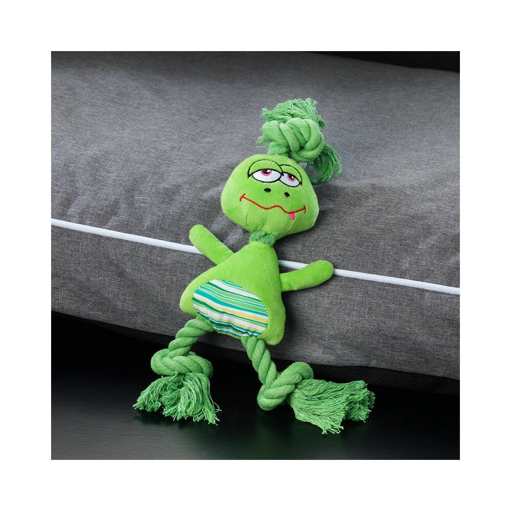 Lejetøj til den legesyge hund eller hvalp. Et rebdyr forklædt som en skøn frø i grøn.