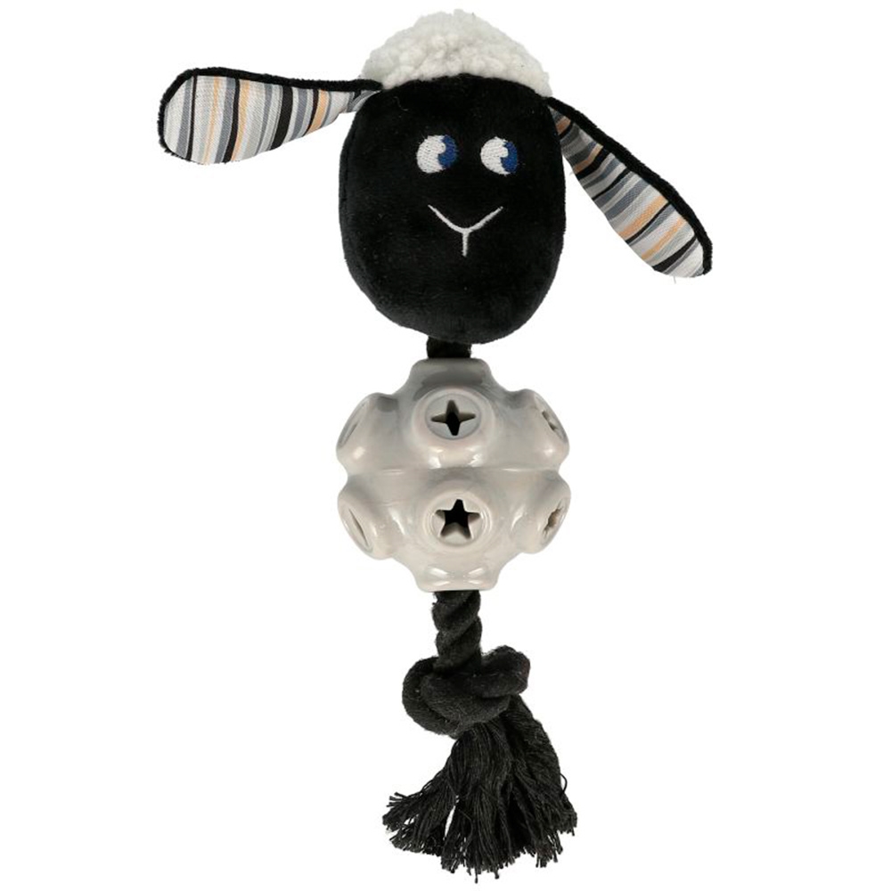 Super sjovt plys hoved af et får, med en gummibold som mave og et reb for enden.