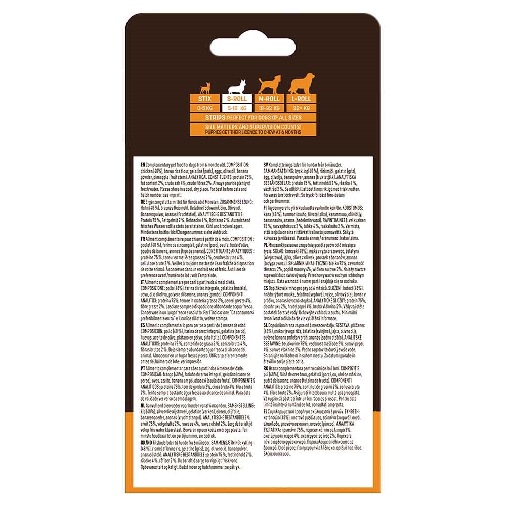 Tyggeben fremstillet af høj kvalitet. Brun ris mel, olivenolie, æg, banan, vegetabilsk gelatine, ananas og som proteiner kylling, okse, laks og vildtkød. Fordøjeligheden er ca 80% hvor ben af råhud har et gennemsnit på ca 18%.
