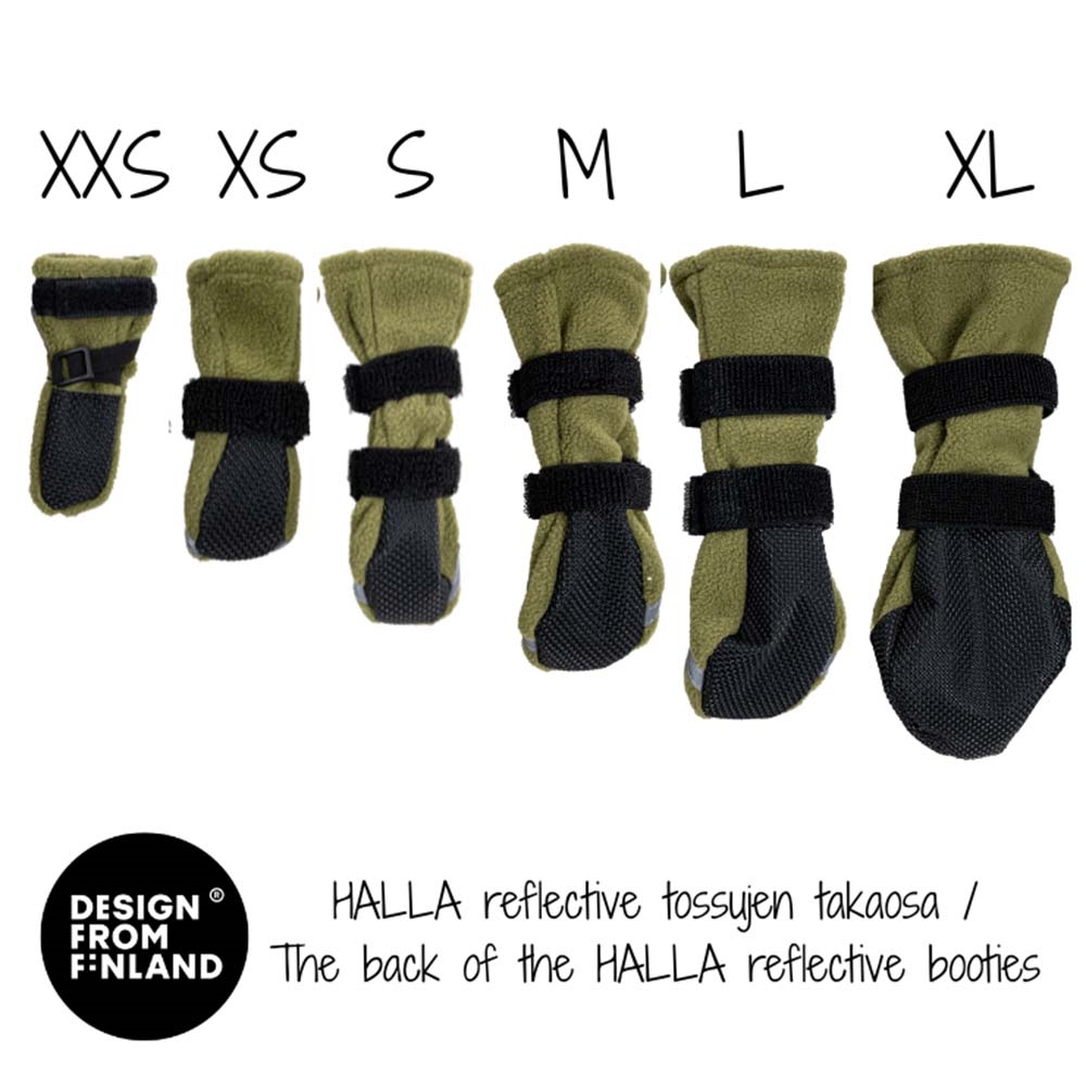 Halla skoene er lavet af fleksibelt fleece af høj kvalitet og tilbyder exceptionel komfort og holdbarhed. Den skridsikre, vandafvisende sål holder poterne forholdsvis tørre og stabile på glatte overflader, mens slidsen foran og velcrolukningen (hook & loop) gør dem hurtige og nemme at tage på.
