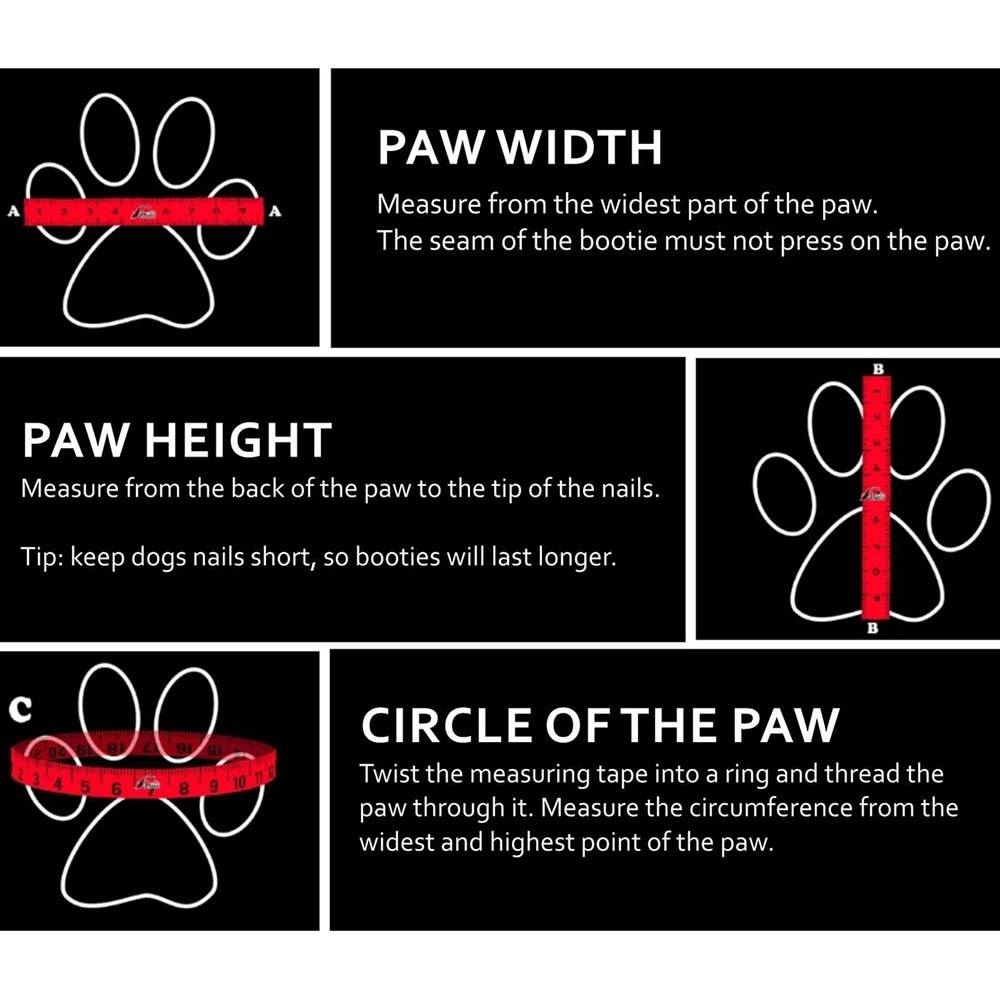 B) Potelængde: Mål bag trædepuderne og helt ud til kløerne. (Tip: Husk at holde kløerne korte nok til at forhindre, at støvlerne ribber.)