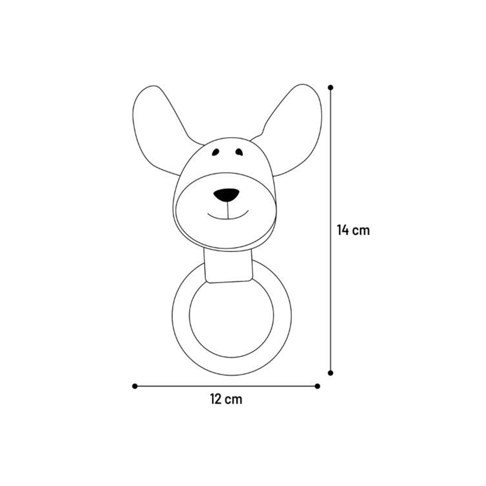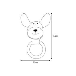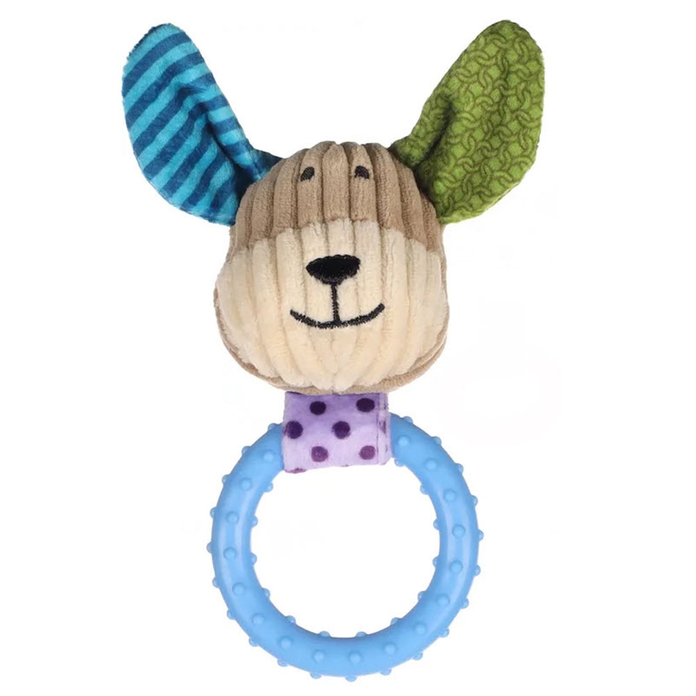 Denne søde bamse er udformet som en hund. I hovedet er der et piv, som små hvalpe elsker. Den lyseblå hårde gummiring er god til at massere de ømme hvalpetænder og gummer.