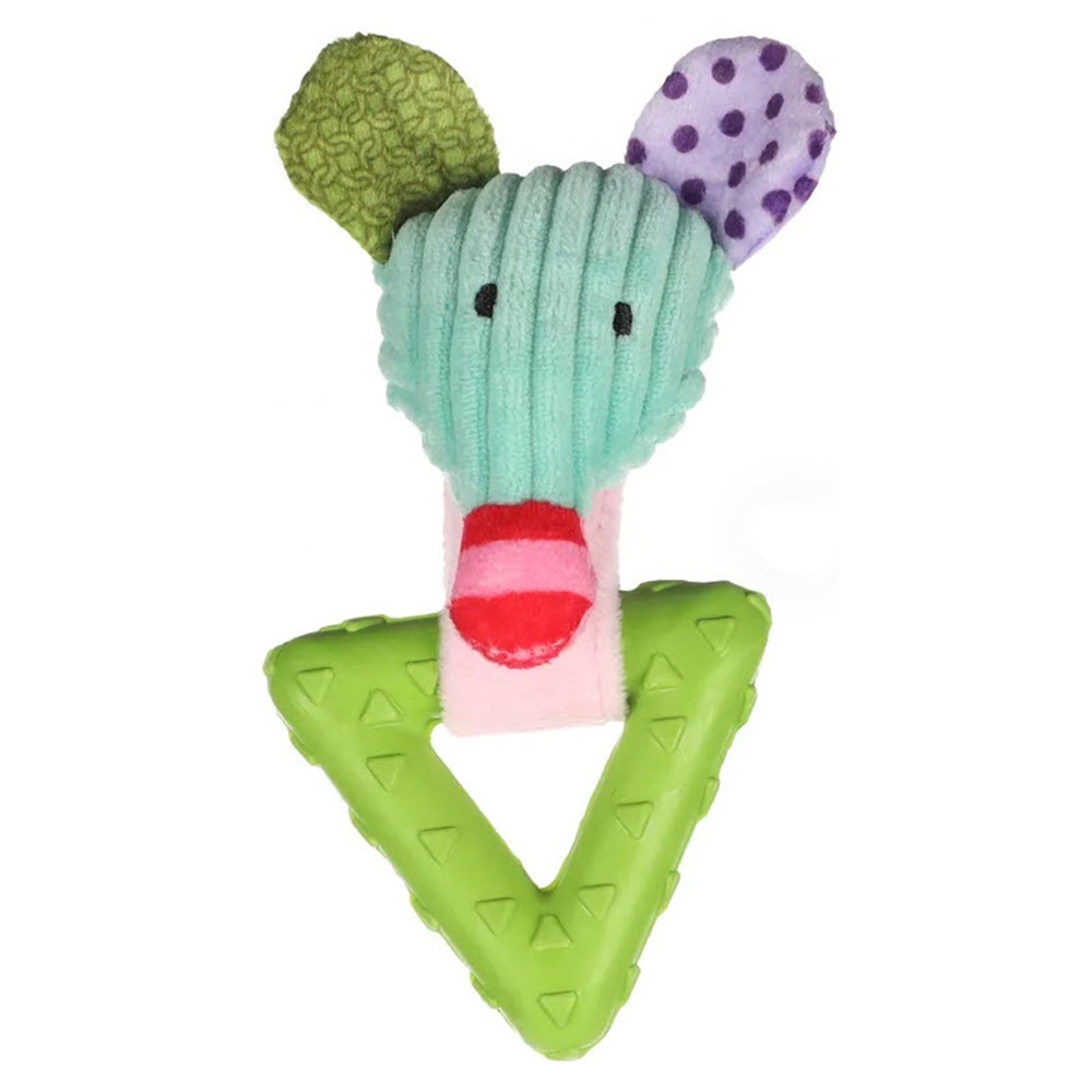 Denne søde bamse er udformet som en hund. I hovedet er der et piv, som små hvalpe elsker. Den grønne trekantede hårde gummiring er god til at massere de ømme hvalpetænder og gummer.