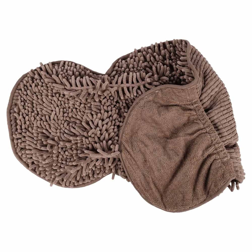 Super håndklæde til hunden eller katten med to stiklommer, som du placerer hænderne i. Farven er brun.