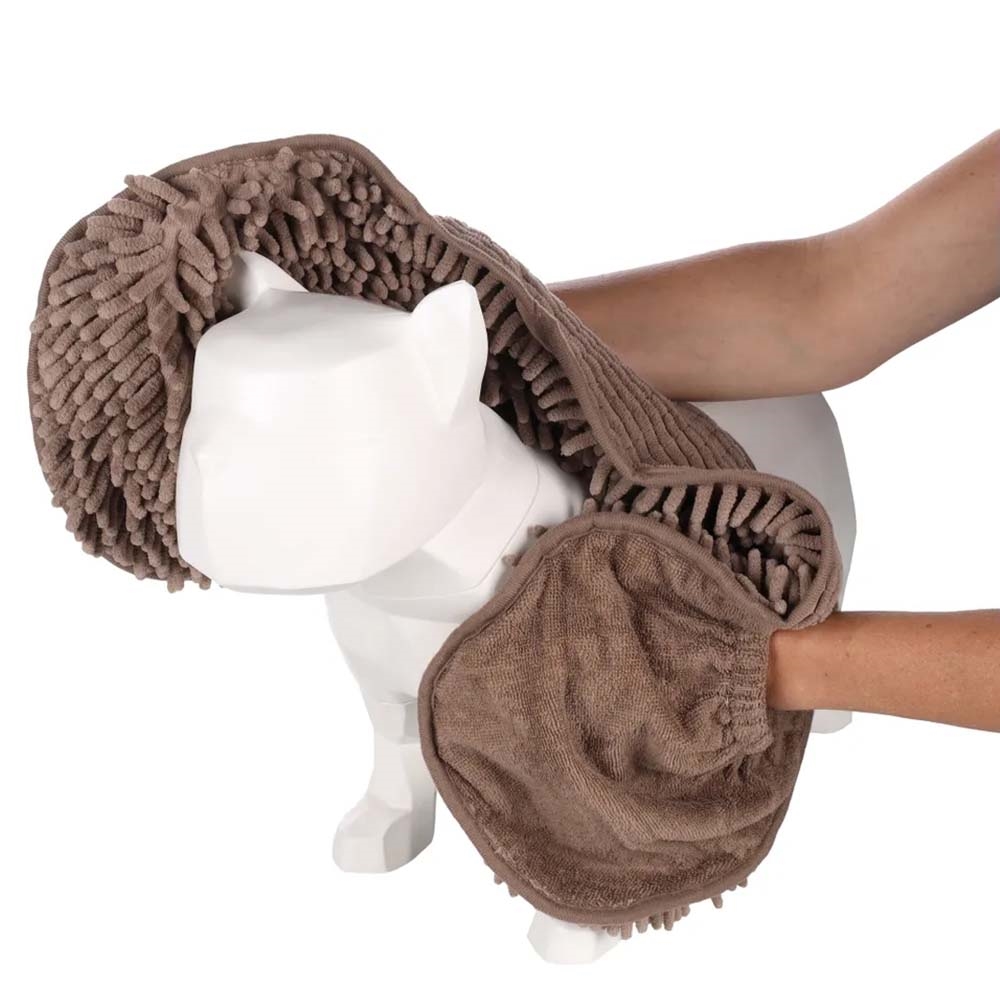 Dette håndklæde er perfekt til når du skal tørre din hund eller kat. Håndklædet er fremstillet af superabsorberende mikrofiber, som tørrer hurtigt. Håndklædet har to stiklommer, som du stikker hænderne i, når du skal tørre dit kæledyr.