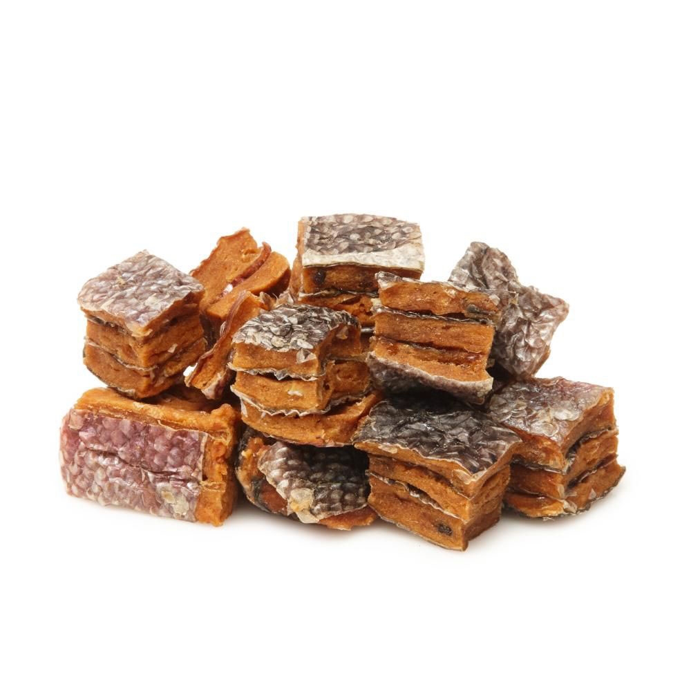 Lækre naturligt tørrede lakse stykker som en delikat snack til hunden.