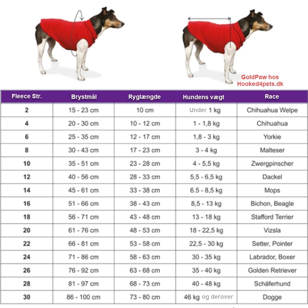 Har du en fleecetrøje fra Goldpaw i forvejen, så er det samme størrelse du skal vælge. Hvis den Goldpaw du har derhjemme sidder godt til, kan det anbefales at tage nummeret større i denne goldpaw, da den bliver en smule mindre omkring kroppen på hunden, fordi der er to lag fleece i den.
