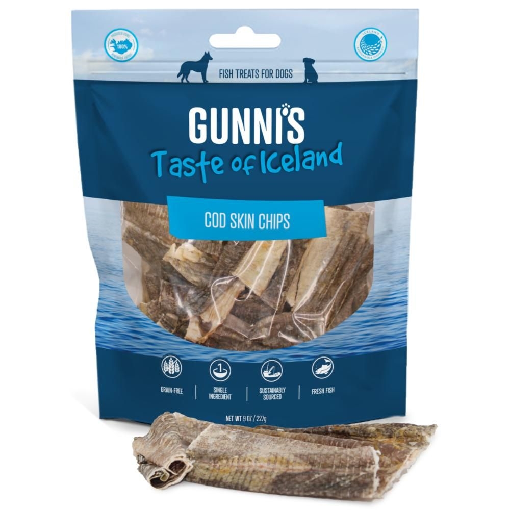 Gunnis Taste of Iceland Cod Skin Chips. Super lækre hundegodbidder i forskellige størrelser lavet af ren torskeskind. Hver pose chips er fuld af smag. Med høj fordøjelighed, og tyggeegenskaber, der hjælper med at fremme sunde tænder og tandkød.