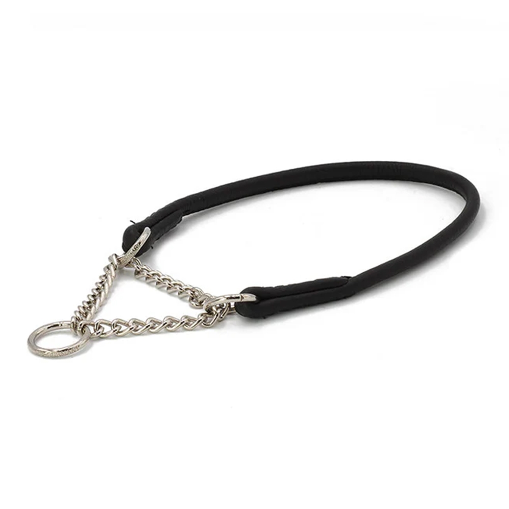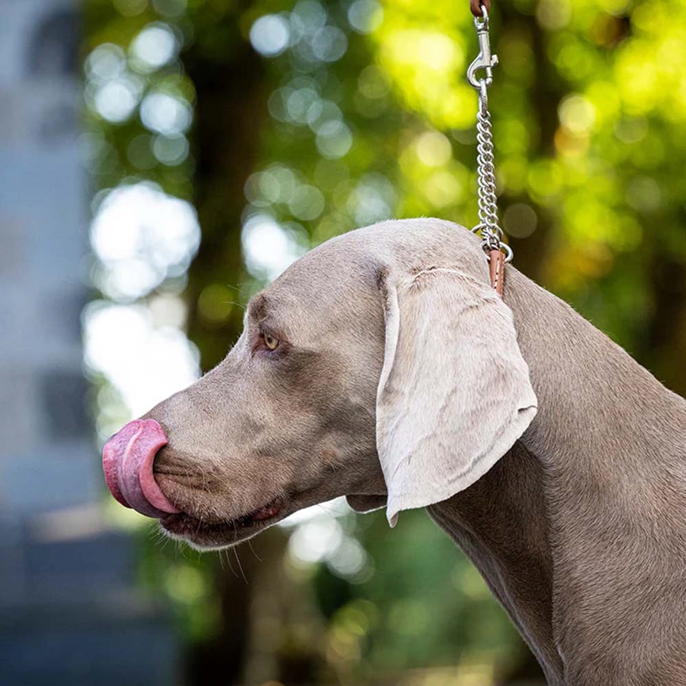 Det smidige læder sikrer exceptionel komfort og fremhæver halsbåndets sofistikerede udseende i showringen. Den integrerede kædeindsats forhindrer pålideligt hunden i at glide ud uden at blive kvalt. Det afrundede design gør, at halsbåndet former sig perfekt til halsen og ligger blidt mod pelsen.