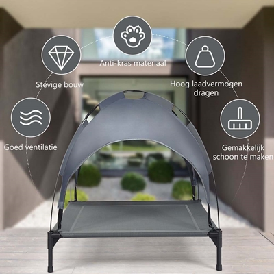 Hævet hundeseng med solsejl i farven grå. Denne stabile og åndbare hundeseng er velegnet til både indendørs og udendørs brug.