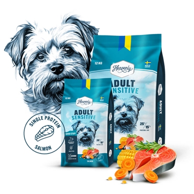Heavenly Sensitive - Et svenskproducere kornfrit fuldfoder til voksne hunde af alle racer med norsk laks som eneste animalske protein. Foderet er ernæringsmæssigt afbalanceret og er særligt velegnet til hunde med følsomme maver, hud- og pelsproblemer, da foderet er mildt og skånsomt. Et velsmagende foder, der er fremragende til kræsne hunde.