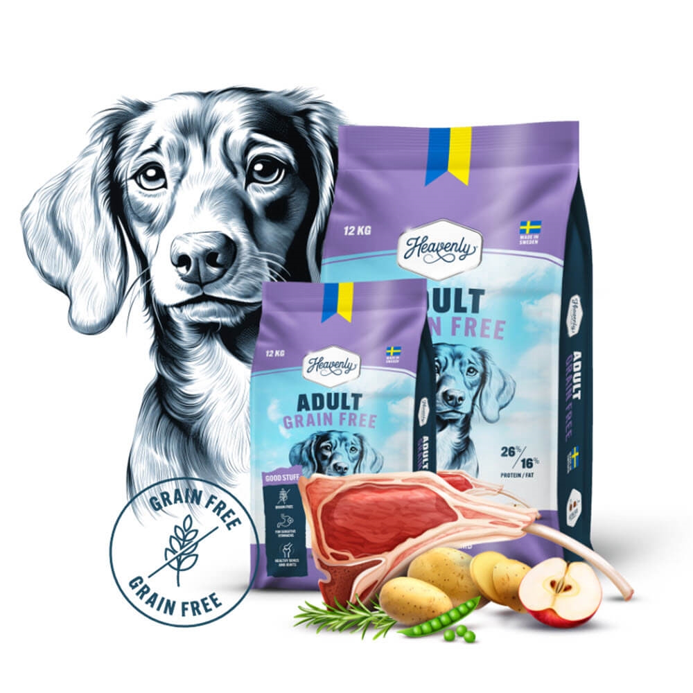 Heavenly Adult Grain Free - Et svenskproduceret kornfrit fuldfoder til voksne hunde af alle racer med lam. Foderet er ernæringsmæssigt afbalanceret, mildt og skånsomt, hvilket er godt for hunde med følsomme mave.
