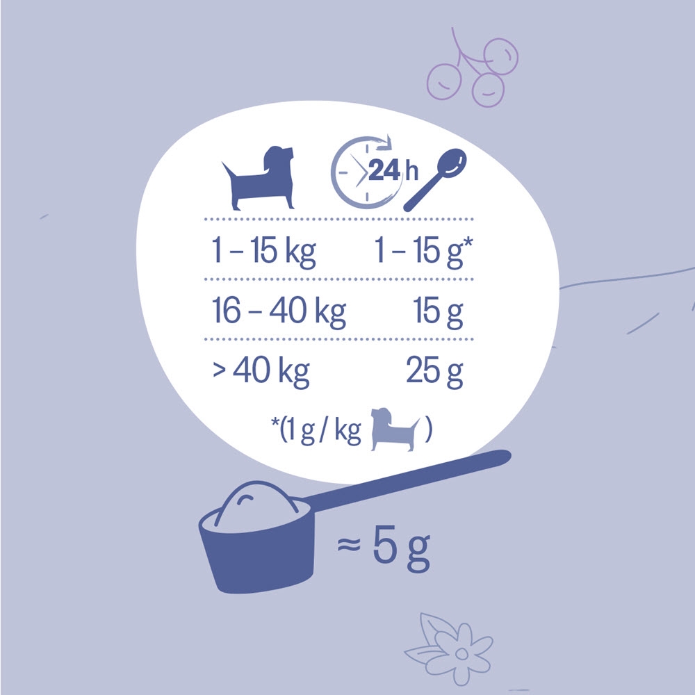 Hokamix Forte er derfor det ideelle fodertilskud til din hund, da det består af 30 forskellige urter, som hver har en særlig, gavnlig virkning på hundens krop. Hokamix Forte indeholder komponenter som er med til at fremme fordøjelsen og hjælper til et sundt stofskifte. Derudover muliggør det en optimal optagelse af alle næringsstoffer i det daglige foder og er med til at sørger for vitalitet og velbefindende.