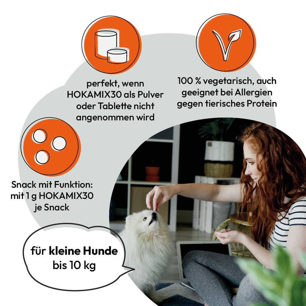 Hokamix pulver opskriften i velsmagende snack-form. Særligt udviklet til kræsne hunde der ikke bryder sig om Hokamix-pulverets naturlige lugt. Snacken er ligesom pulveret et rent naturprodukt, uden kemiske tilsætningsstoffer og kunstige aromastoffer.