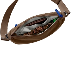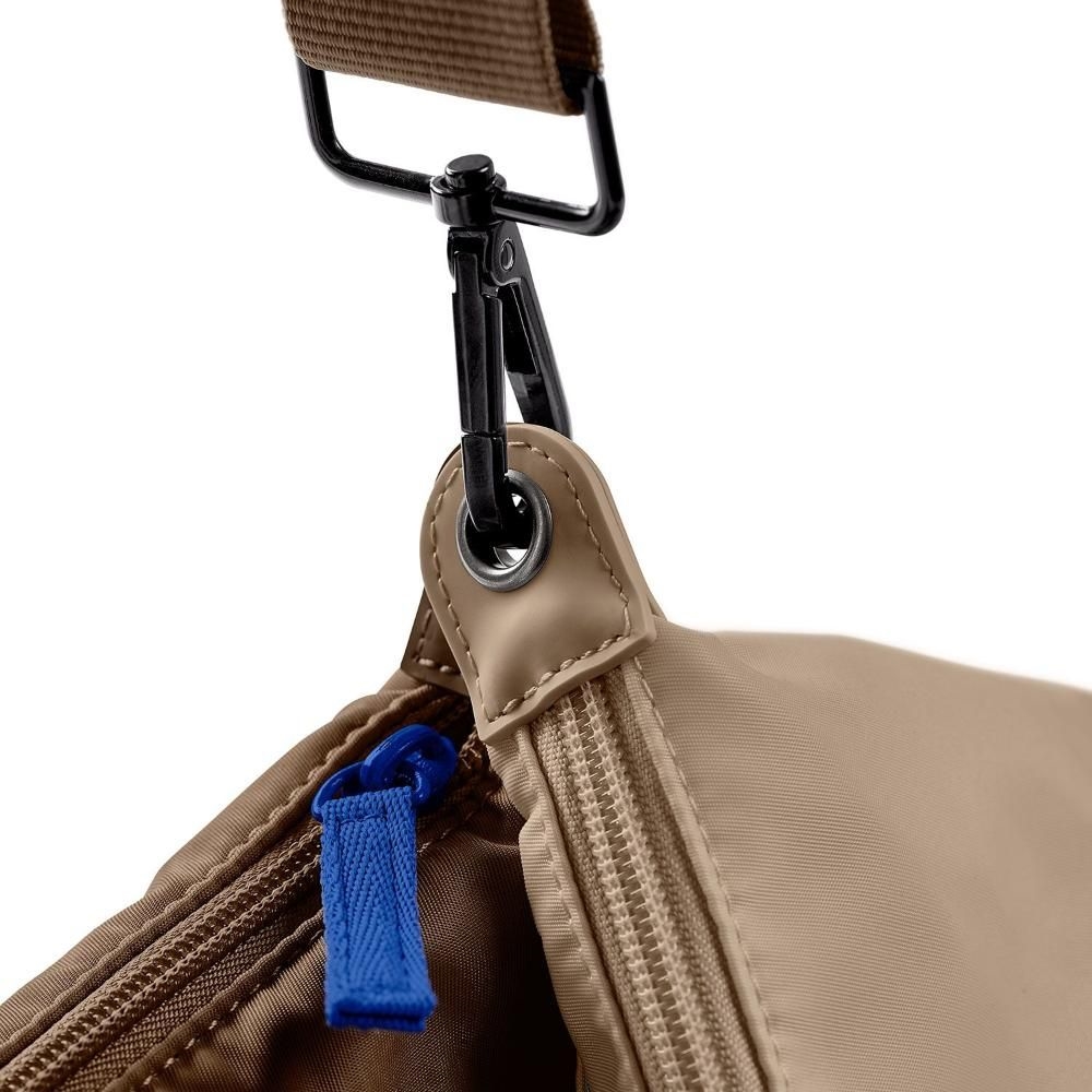 Med høm høm-poseholder med nem adgang. En aftagelig inderlomme i kontrastfarve giver ekstra opbevaringsplads. Kan hægtes på stroppens karabinhager, så den kan bruges som f.eks. godbidspose.