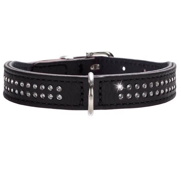 Halsbåndet er lækkert blødt og fuldvarvet. Indersiden er behandlet med smudsafvisende 3M materiale og ydersiden er også fuldfarvet i smukke nye farver. De flotte klare diamanter er ægte Swarovski Crystaller.