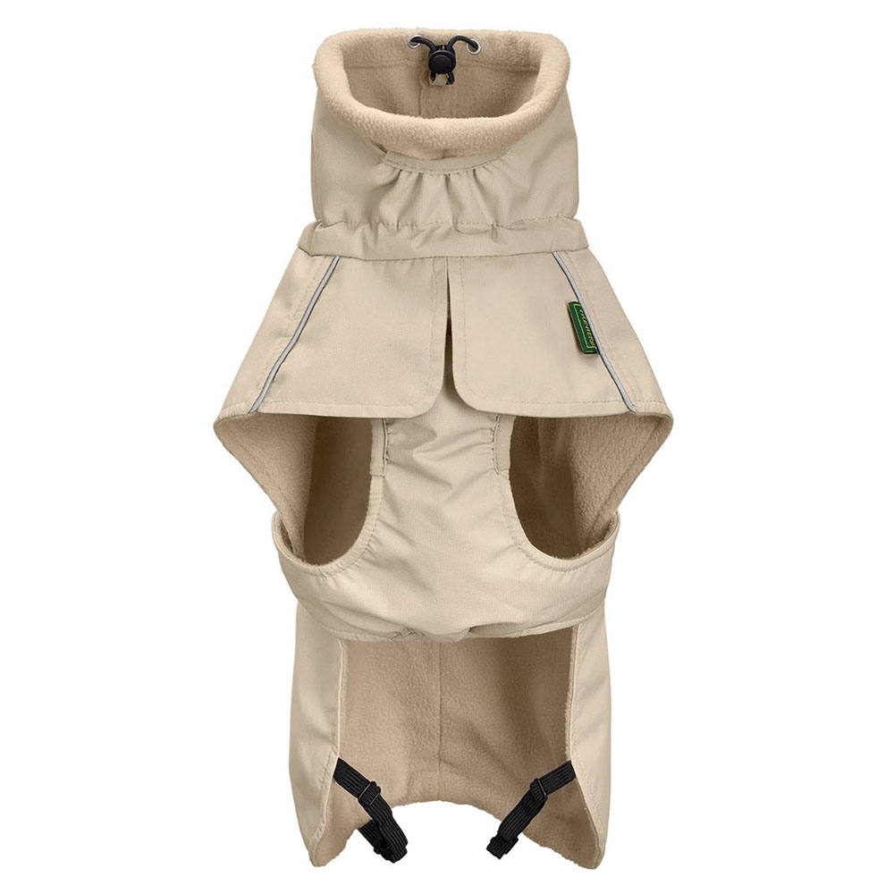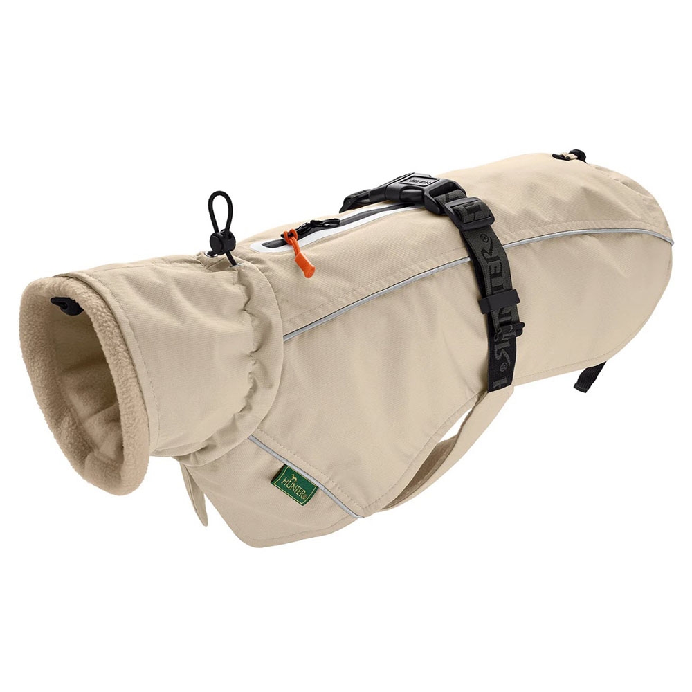 Hundefrakken Nordby af mærket Hunter er lækker vind- og vandafvisende med plysfor og høj halskrave. Jakken har en skulder- og mavevarmer, der holdes på plads af et justerbart bælte.